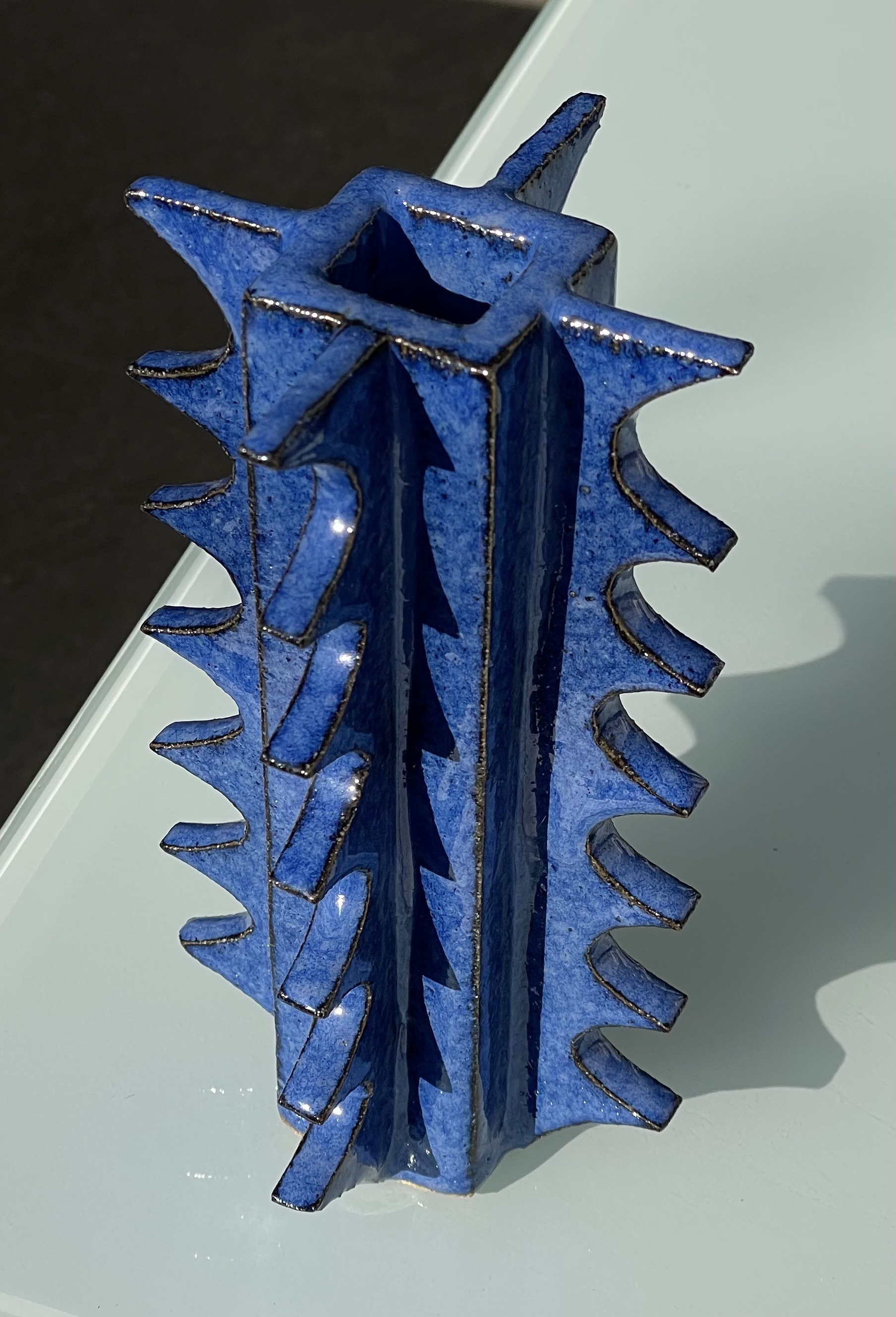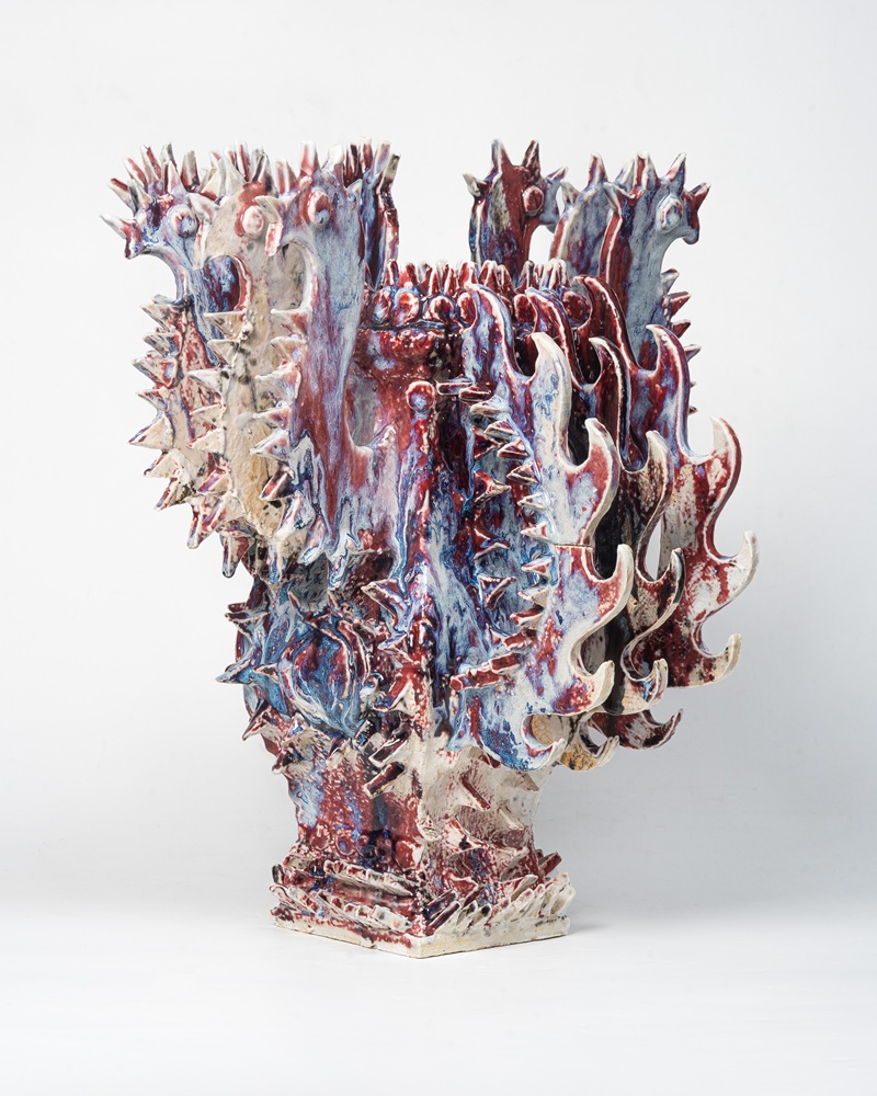 Nikolas Iturralde is a ceramic artist who studied graphic design in Berlin and Valencia. His work is influenced by the iconog- raphy and cultural syncretism of Latin America, as well as its vibrant pop and subcultures. He draws on these diverse references to create eclectic pieces that explore the intersection of ornament, typography, and form through techniques such as screen printing, calligraphy, and sculpture. Nikolas creates works that shift between two- and three-dimensional forms, including sculptures, vases, functional objects, and wall piec- es such as tiles and reliefs. His current focus is on ornamentation and patterns, particularly expressed through recurring motifs like fire, flames, and spikes. These forms go beyond decoration, opening up symbolic narratives that reflect themes of desire, passion, and a dreamlike inner world. He has exhibited his work in various galleries and regularly collab- orates with artists and designers from other fields, expanding his perspective and working methods.